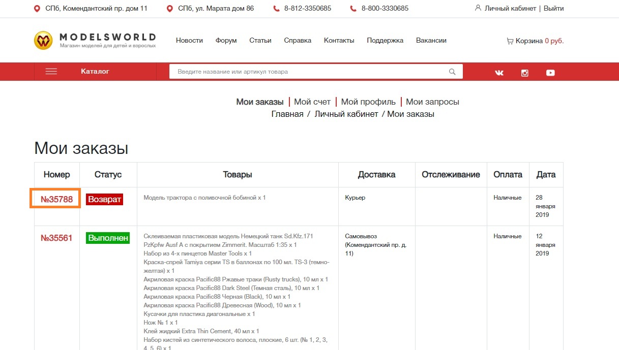 Мои заказыСразу после входа в личный кабинет вы попадаете в подраздел "Мои заказы". В этом подразделе вы можете видеть краткую информацию о всех ваших заказах. Информация представлена в виде таблицы. В таблице отражены номер заказа, статус заказа, содержимое заказа, способ доставки, номер отправления, способ оплаты, дату заказа. При нажатии на номер заказа, открывается развернутая информация по заказу.Статусы заказа могут быть следующими.