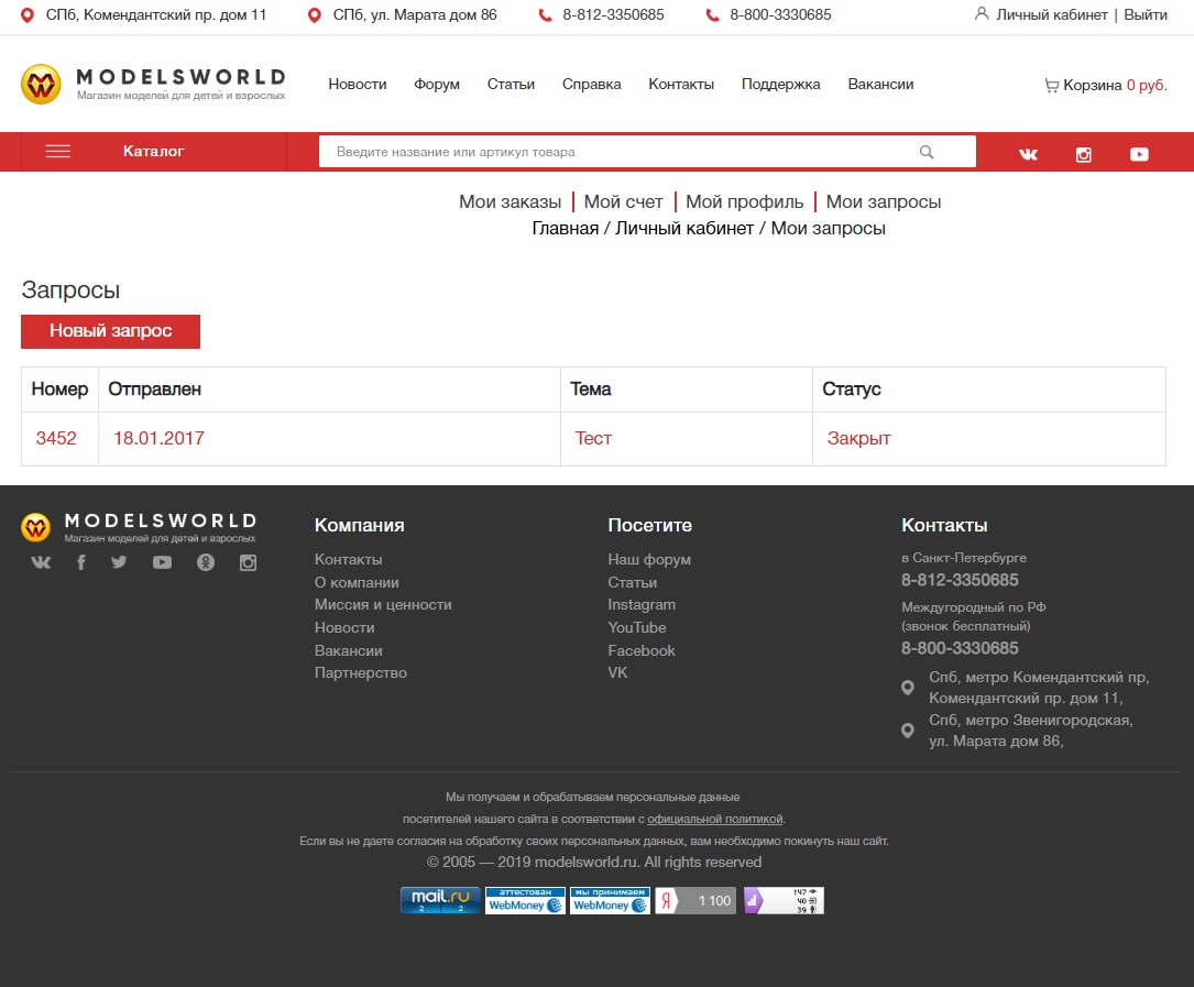 Мои запросыПосле регистрации в нашем магазине каждый пользователь может обратиться к нашим специалистам с вопросом. Воспользовавшись формой подачи запроса в этом разделе, нажав на кнопку Новый запрос.Ниже, отображается история всех Ваших обращений в службу поддержки и статус, присвоенный для каждого запроса. Для получения детальной информации о запросе, просто кликните по ссылке с его номером, или по ссылке на статусе. Вы сможете прочесть ответ нашего специалиста, и, если вопрос еще не решен, можете открыть запрос повторно. К меню |